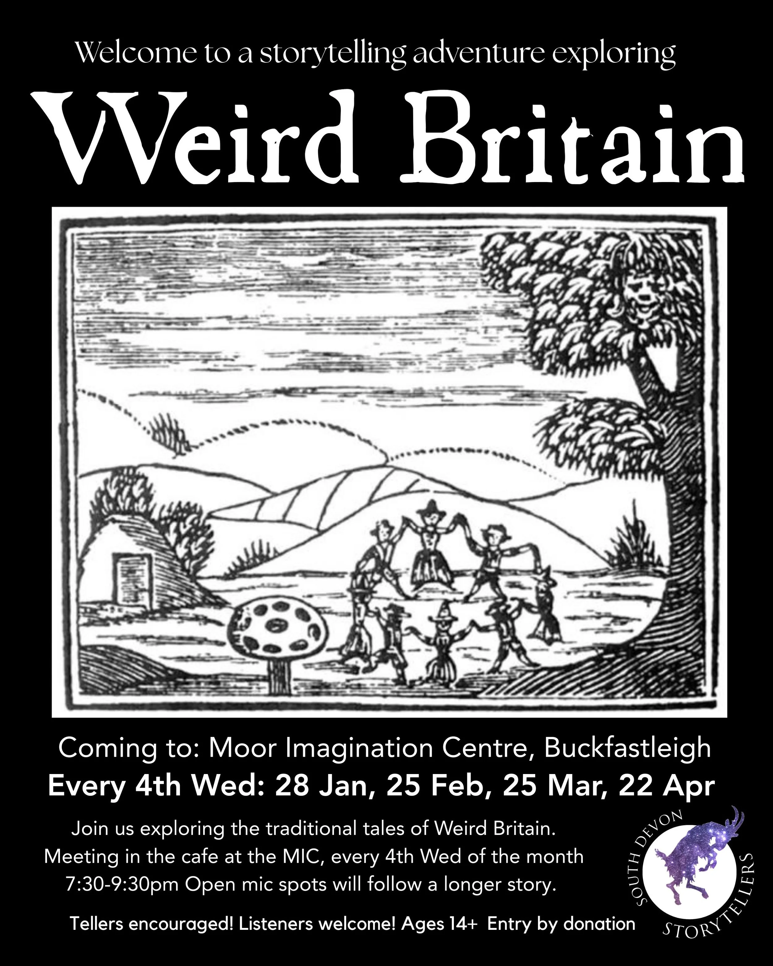 Starting in January, join us every fourth Wednesday of the month for a traditional tale retold exploring the theme ‘Weird Britain’. Open mic spots will follow a longer story.